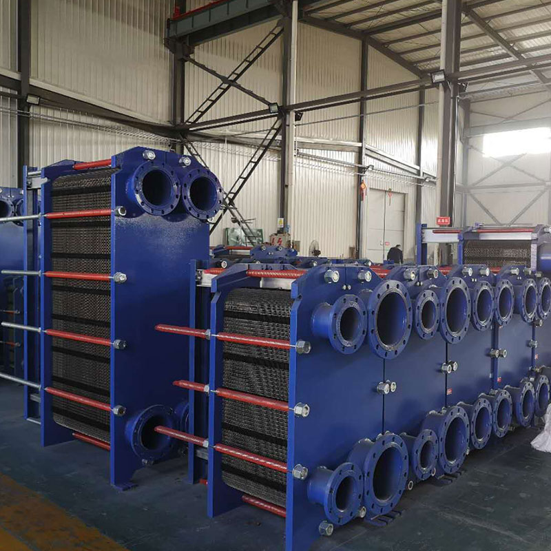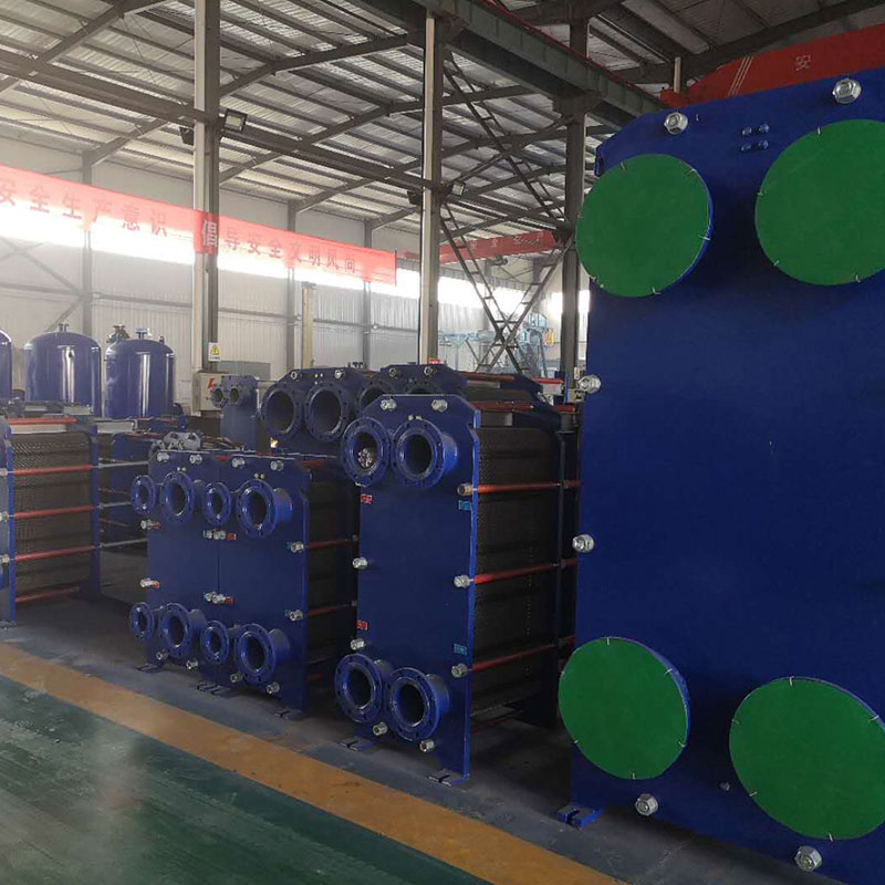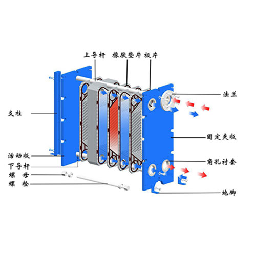 板式熱交換器的組裝形式為懸掛式和非懸掛式。安裝時,熱交換板懸掛在上導杆上。大型板式熱交換器上導杆采用工字鋼結構,下導杆采用矩形管結構。小型板式熱交換器上下導杆采用元鋼結構。活動夾緊板是一種相對固定的夾緊板。在安裝和拆卸過程中,可以在上導杆上移動。較大型號上安裝滾輪,以降低移動阻力。