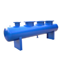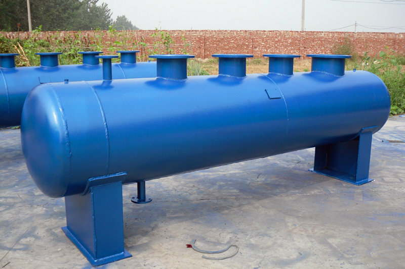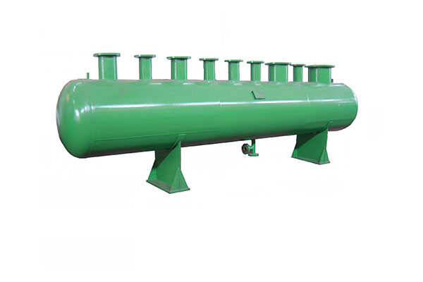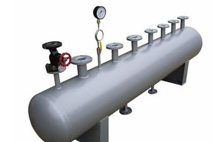 分集水器主要由筒體、封頭、接管、固定支架及附件(補強圈、法蘭)組成。分集水器設備參數主要有:筒體直徑,長度,分水器的進出水口數量,大小,分水器的工作壓力。